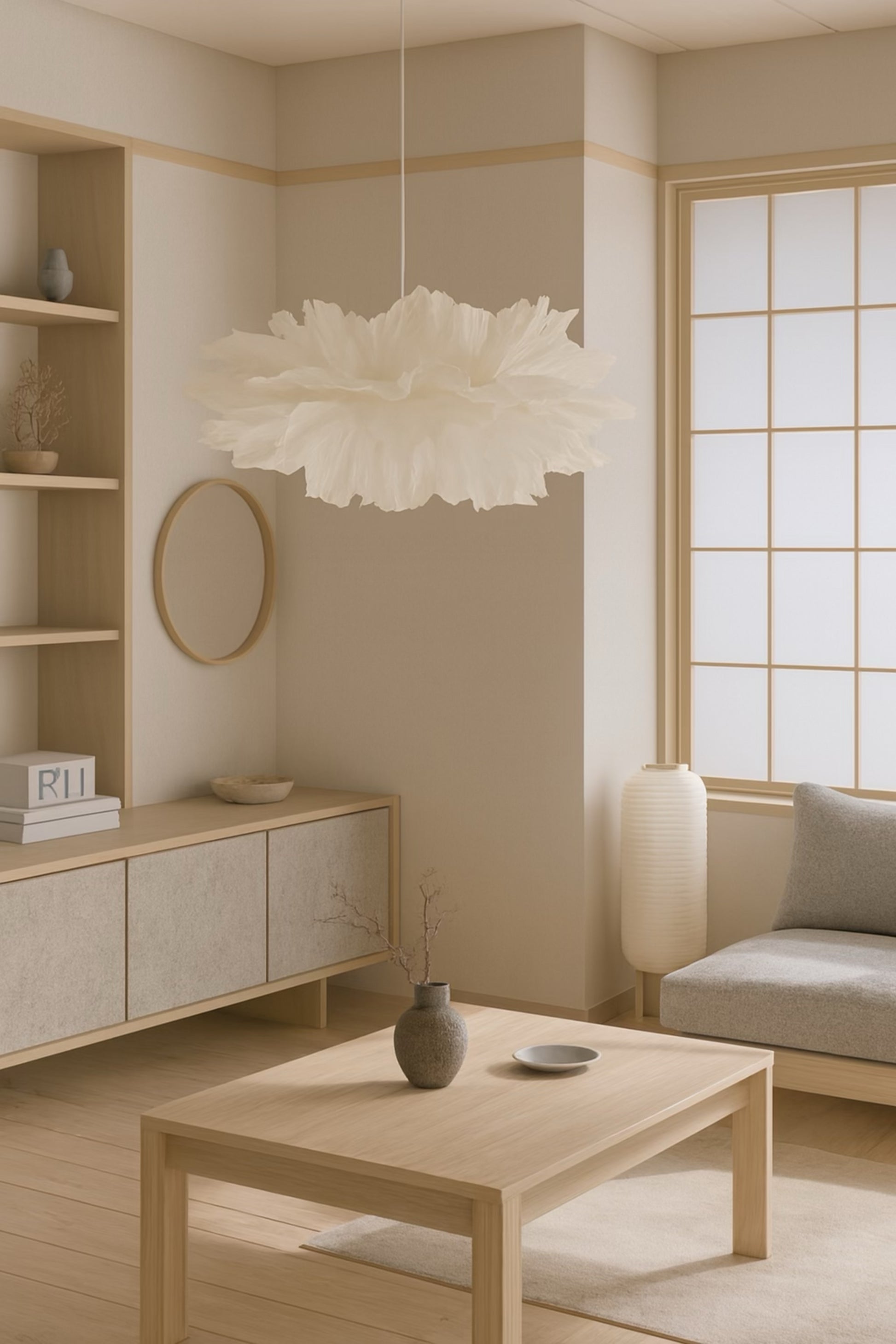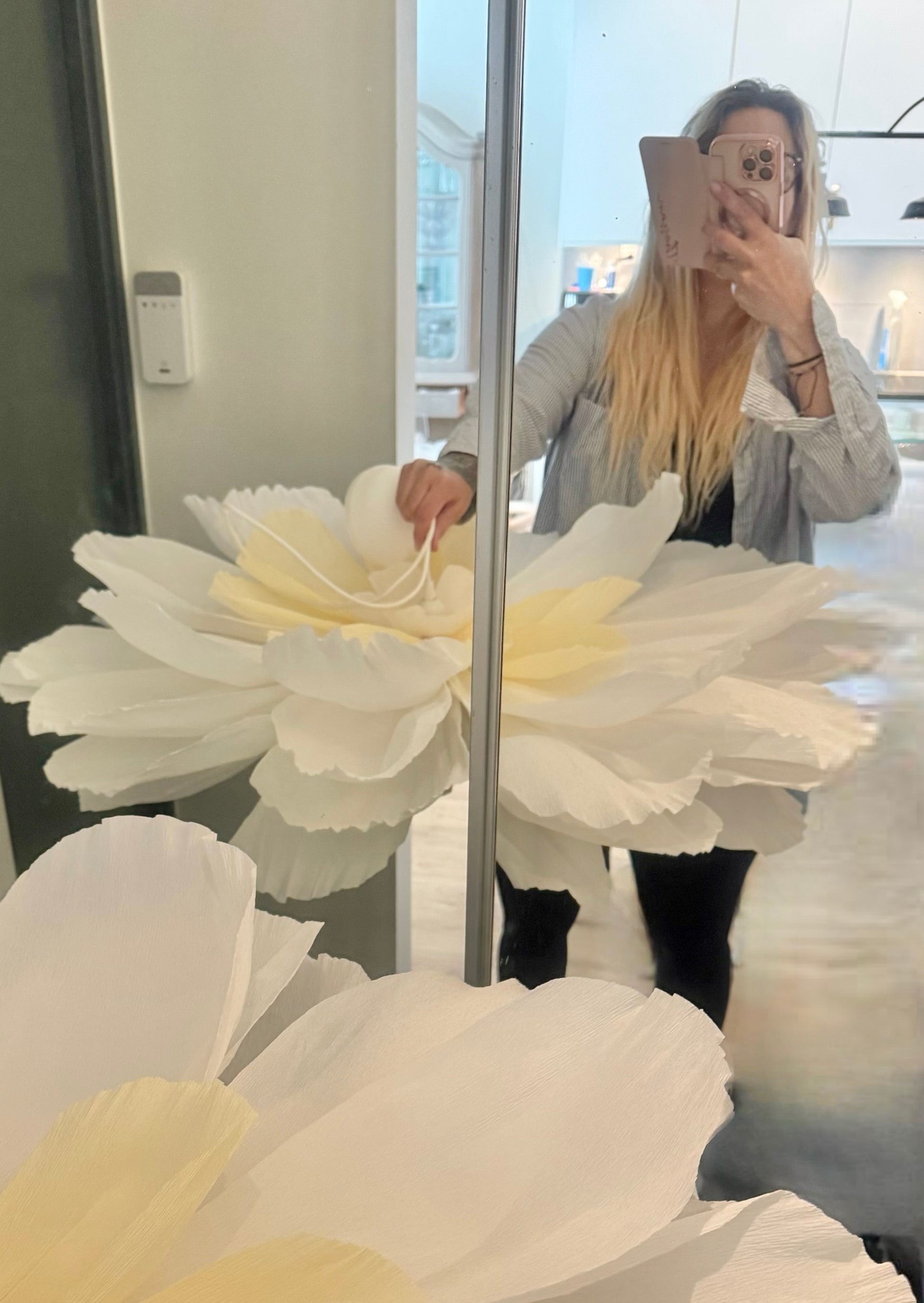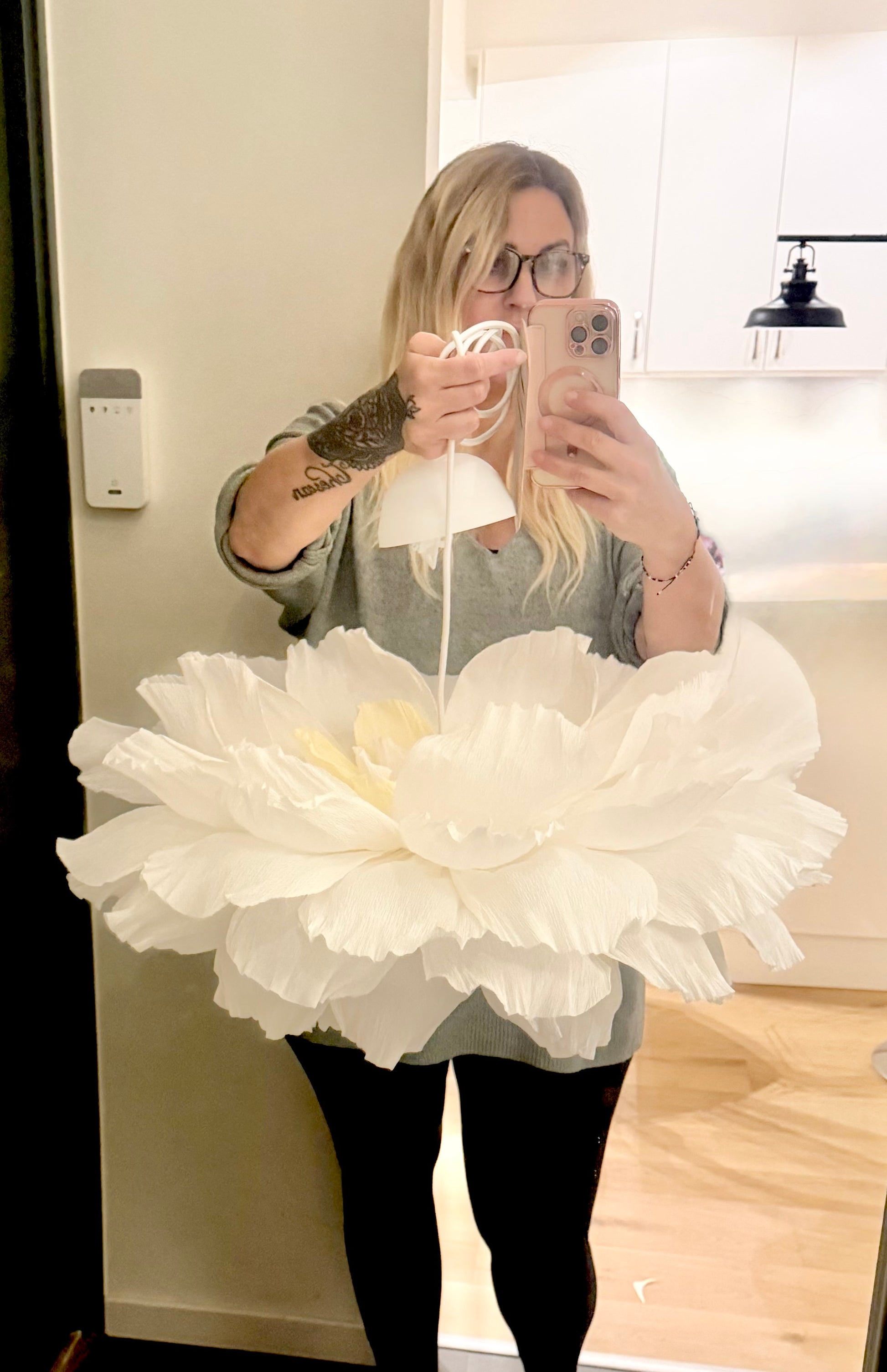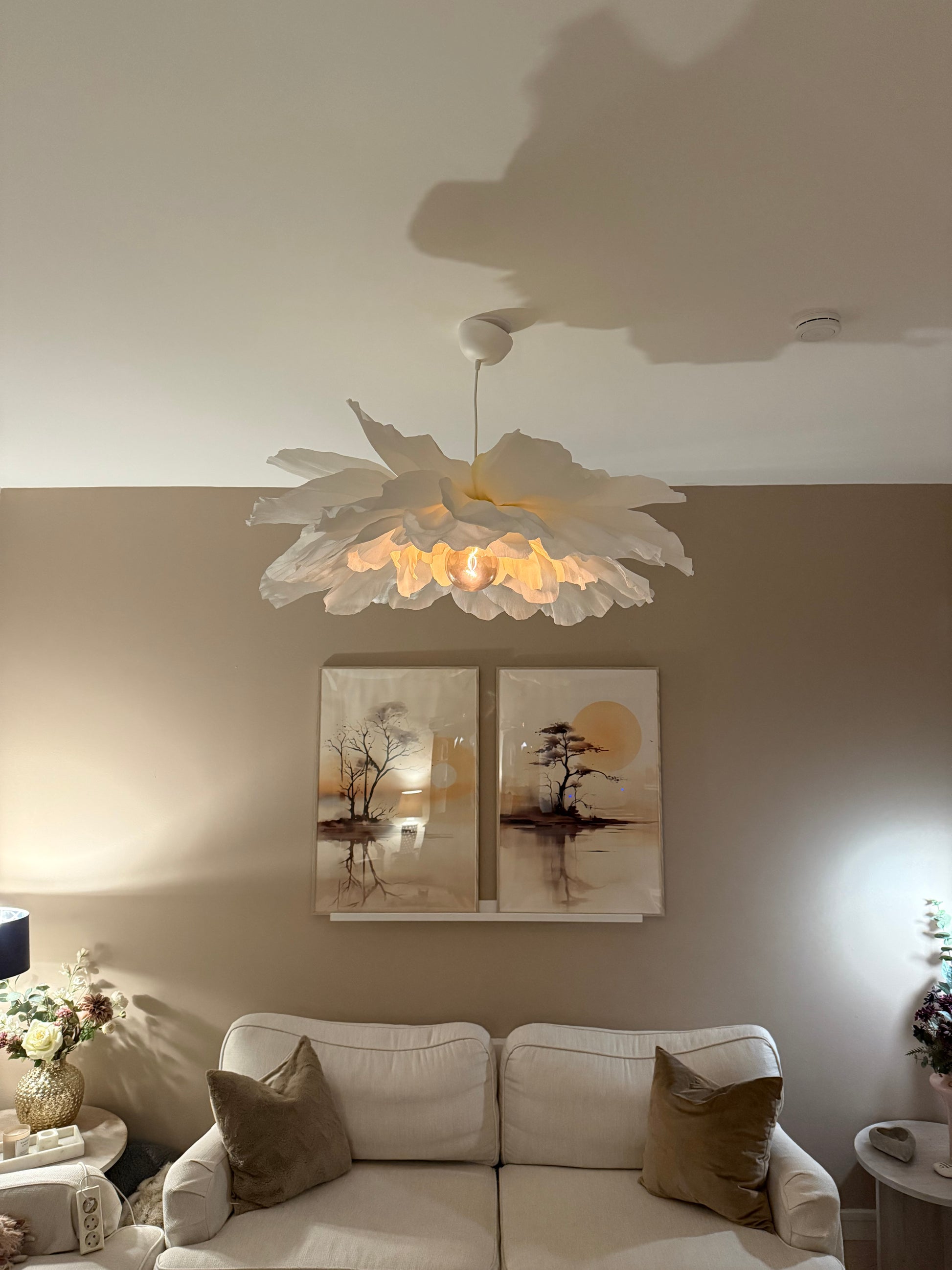 Effektfull Handgjord taklampa. Vit med ljusgula detaljer i form av en blomma.