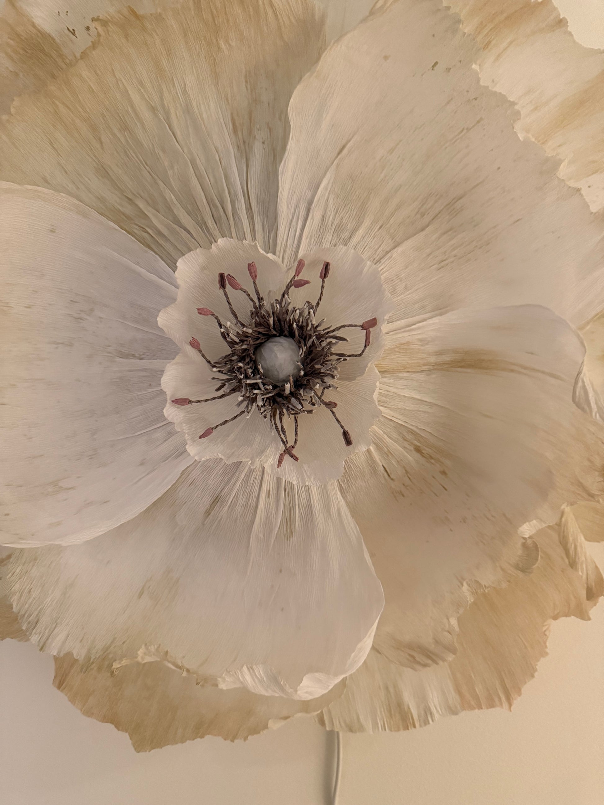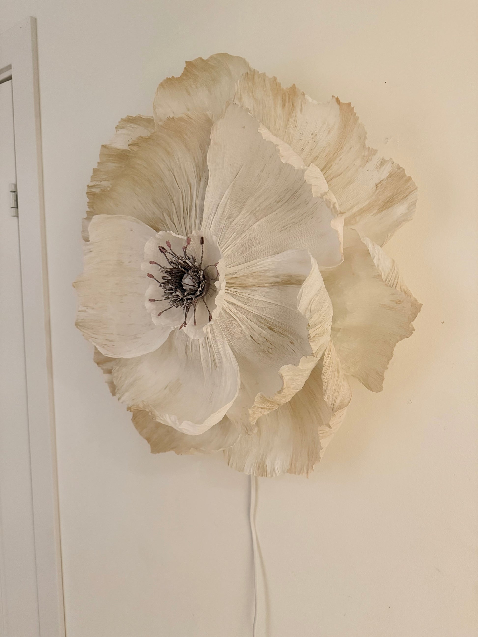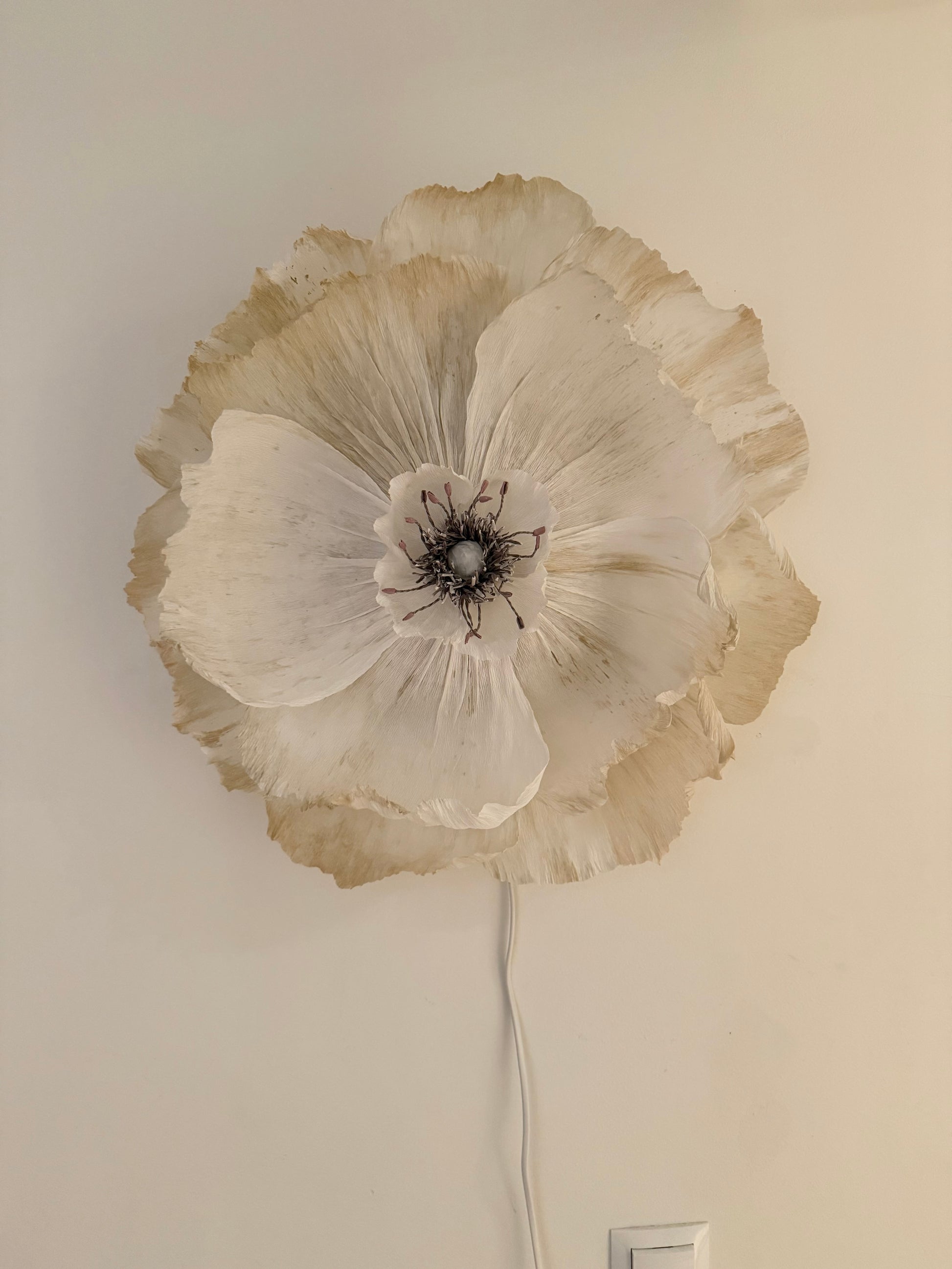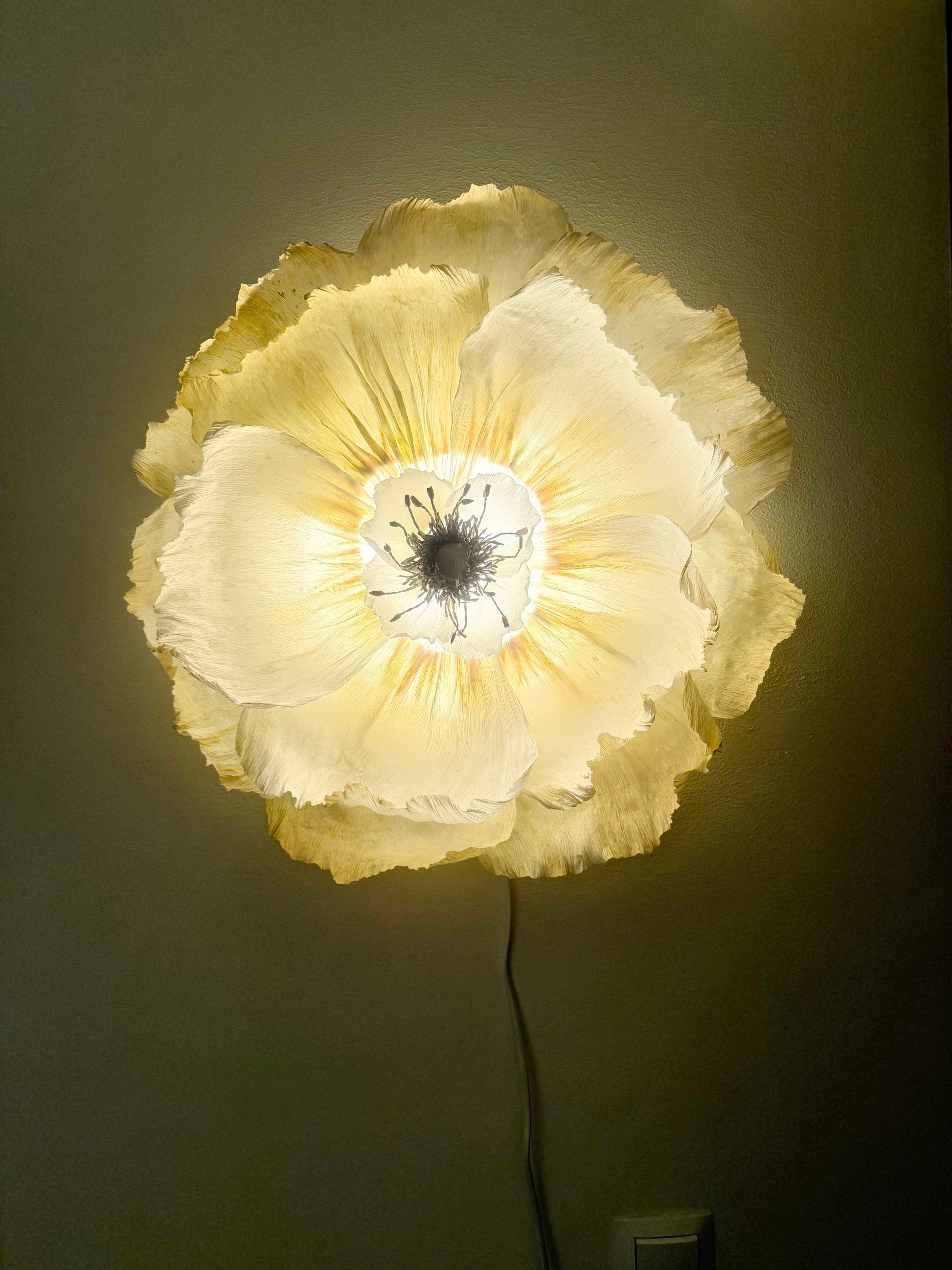 ”Iza” är syskon med ”Bella” (tillverkad samtidigt ifrån samma infärgning av blombladen)och är även hon en fantastisk handgjord blomlampa att ha på väggen. Ett konstverk med funktion.