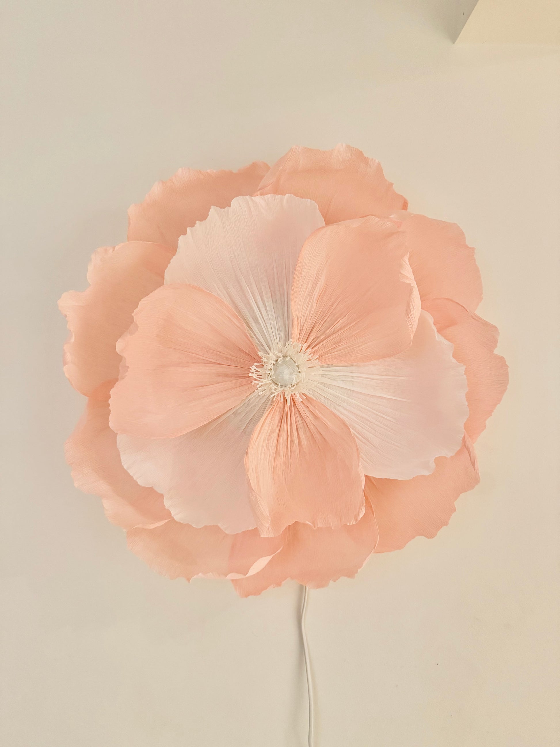 Denna vackra handgjorda vägglampa går i mjukt rosa och vita toner. Lika fin i barnrummet som i övriga hemmet!